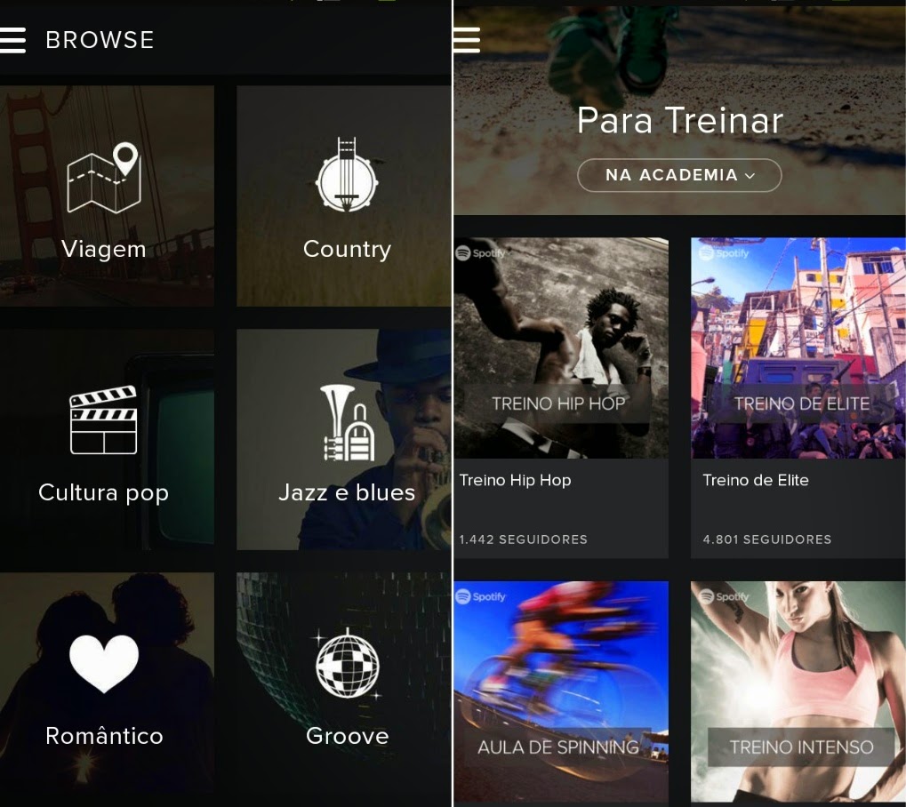 | Na central de navegação (Browse) do aplicativo é possível encontrar playlists prontas (sepadas por temas), os novos lançamentos, as mais tocadas no aplicativo. Na aba Rádio você encontrará músicas separadas por gênero. |